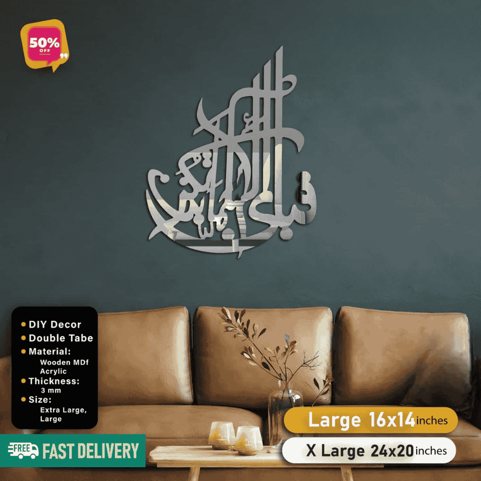 The Islamic Acrylic Calligraphy "Fabi Ayyi Alla" wall decor is a beautifully crafted piece designed to display the four protective Surahs from the Quran. It is made from 3mm MDF wood, offering durability and a sleek look for your home. Key Features: Colors Available: Golden Acrylic, Silver AcrylicSizes: Large (14x16...