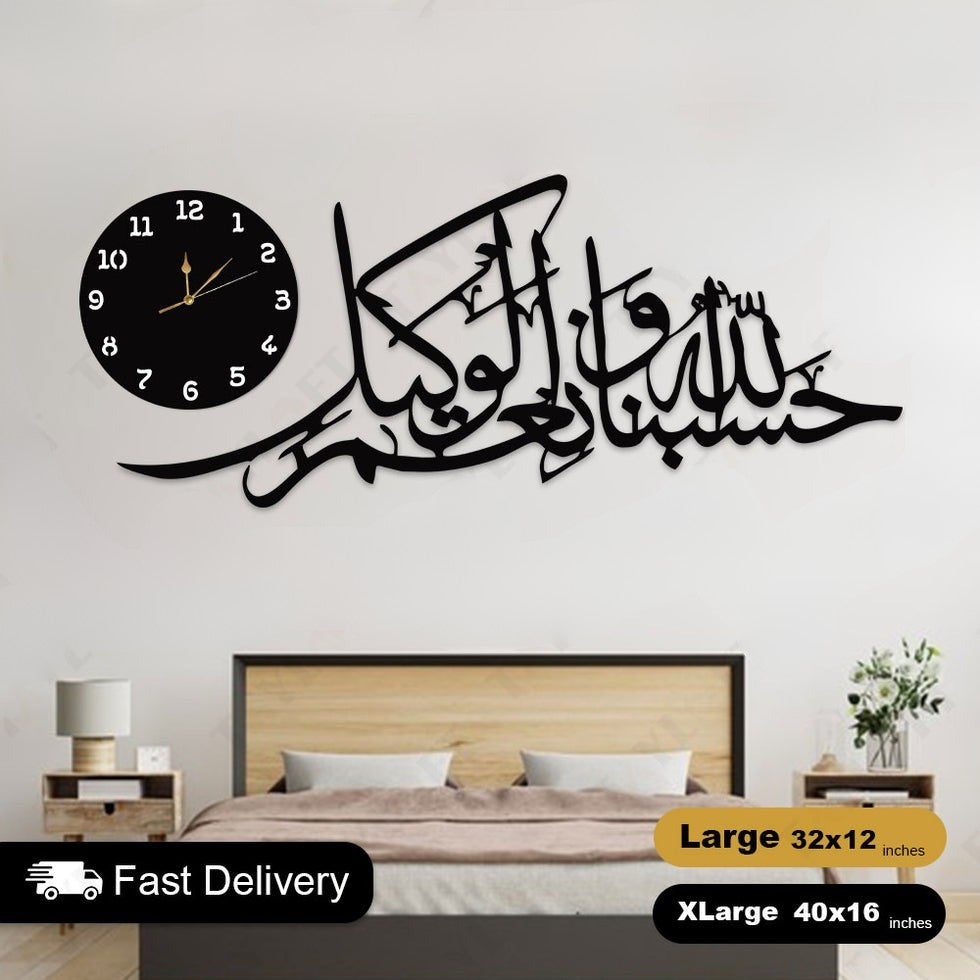 Islamic Wooden Clock Hasbi Allah For Wall Decor
